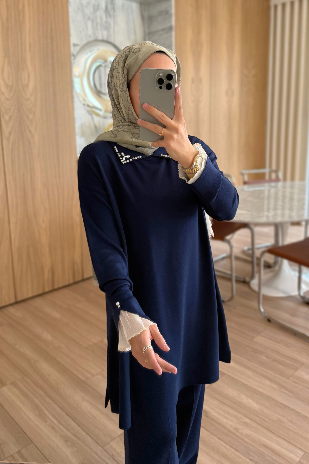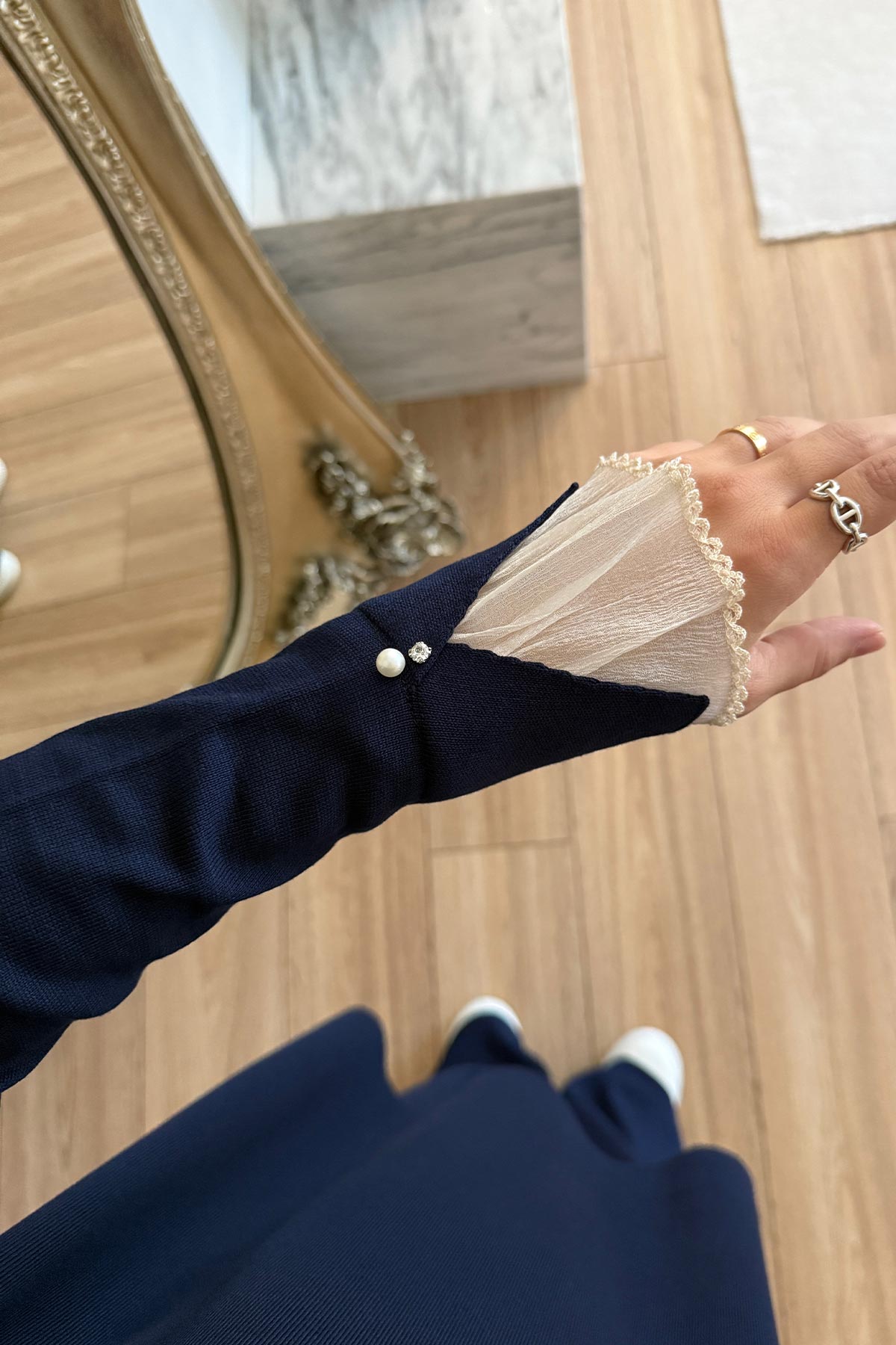 Mercerized Suit with Tulle Sleeves - Navy Blue