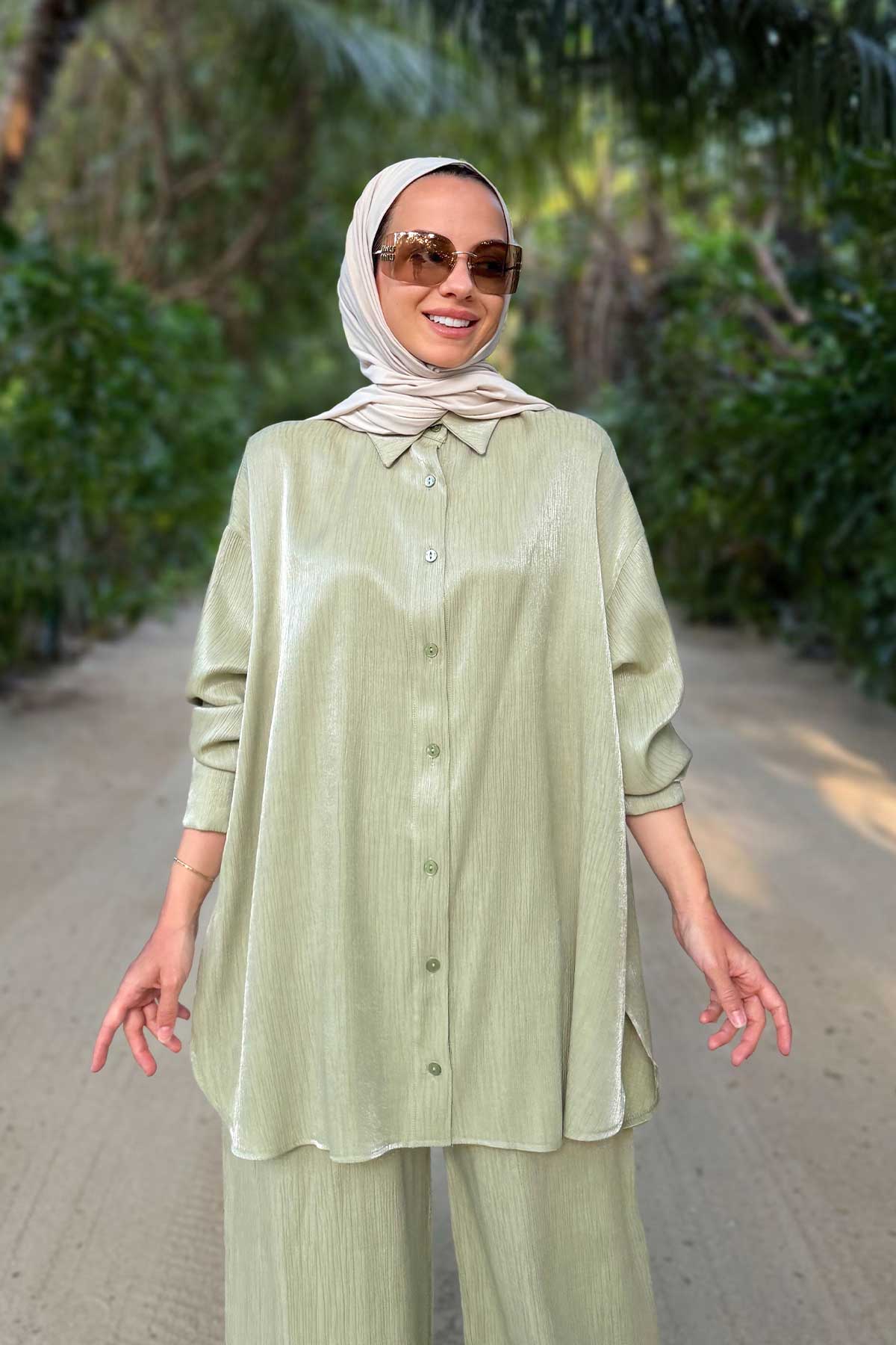 Shiny Textured Loose-Fit Two-Piece Suit - Mint Green