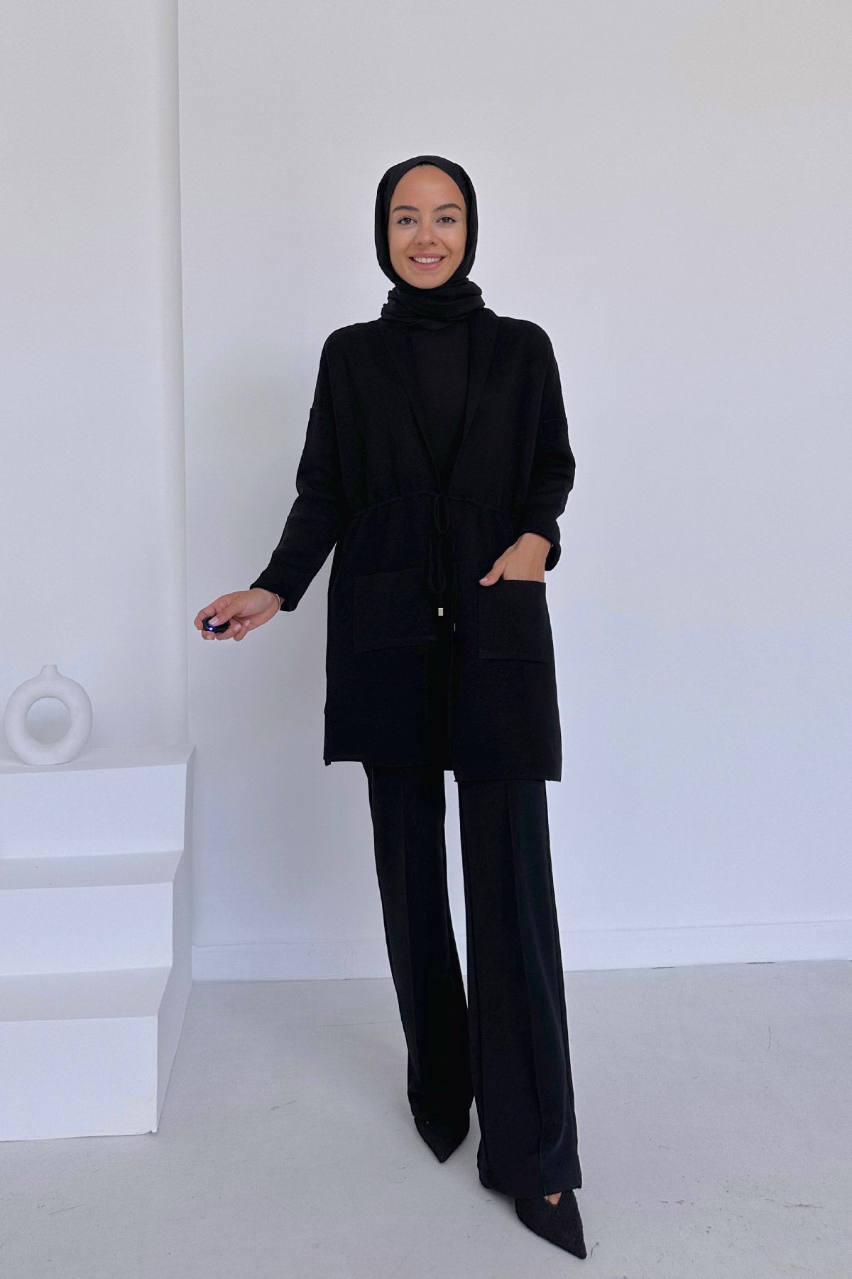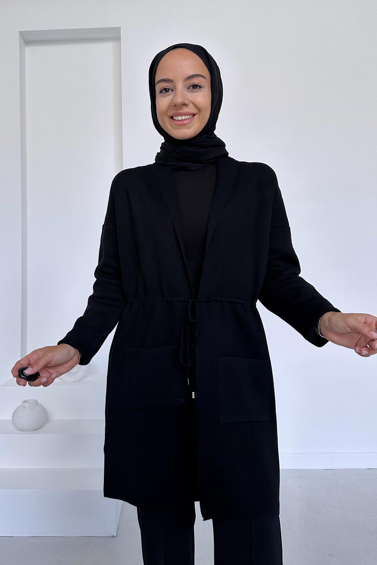 Waist-Tied Double Pocket Mercerized Cardigan - Black