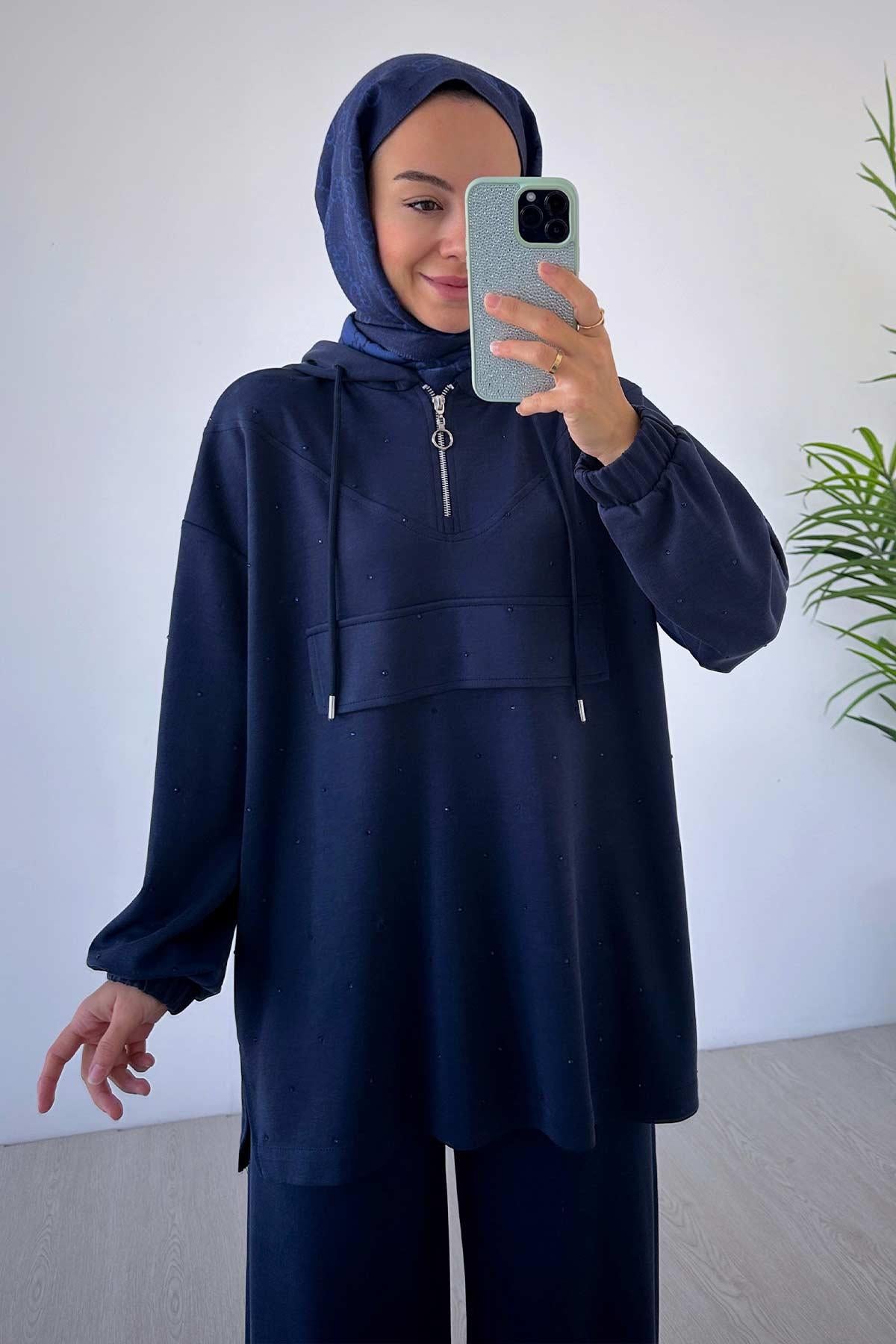 Oysh Fabric Double Set with Front Stone - Navy Blue
