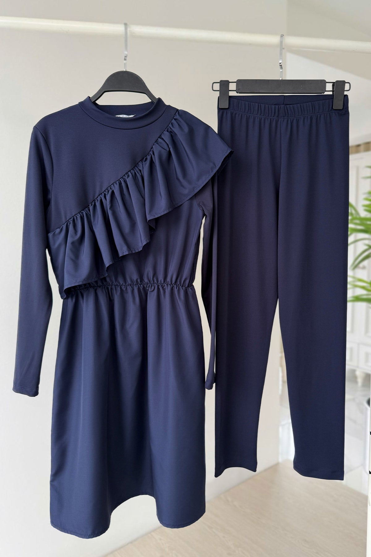 Ruffle Detail Modest Swimsuit - Navy Blue