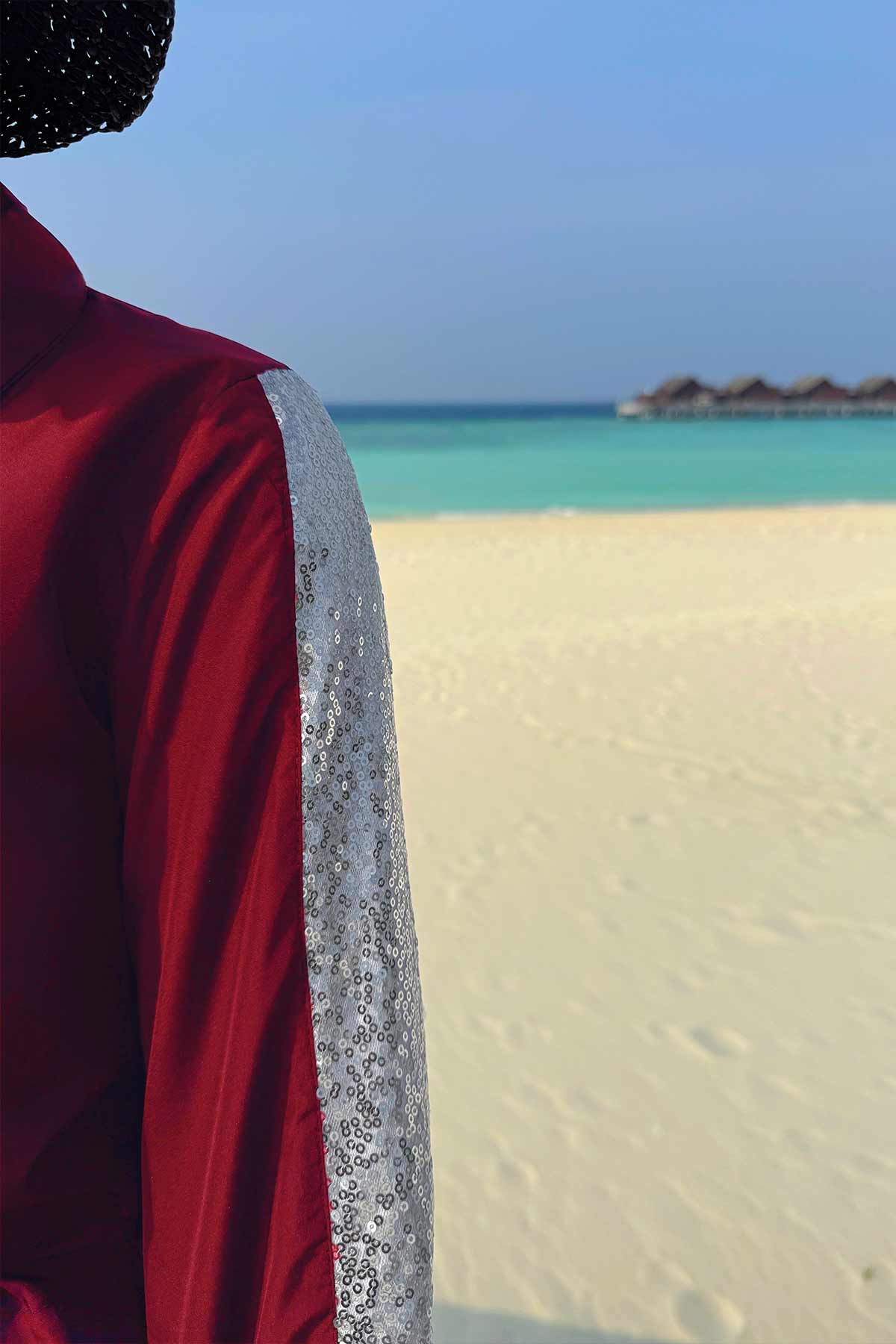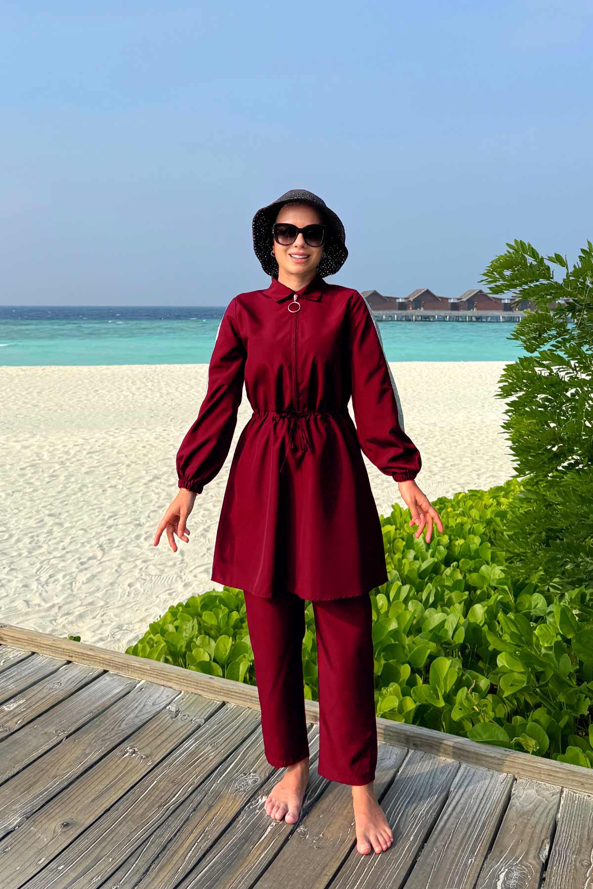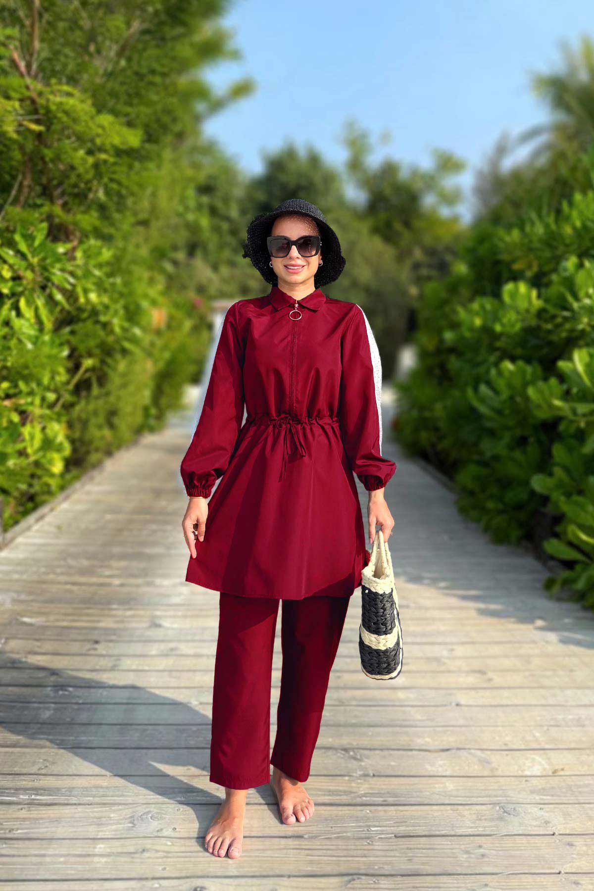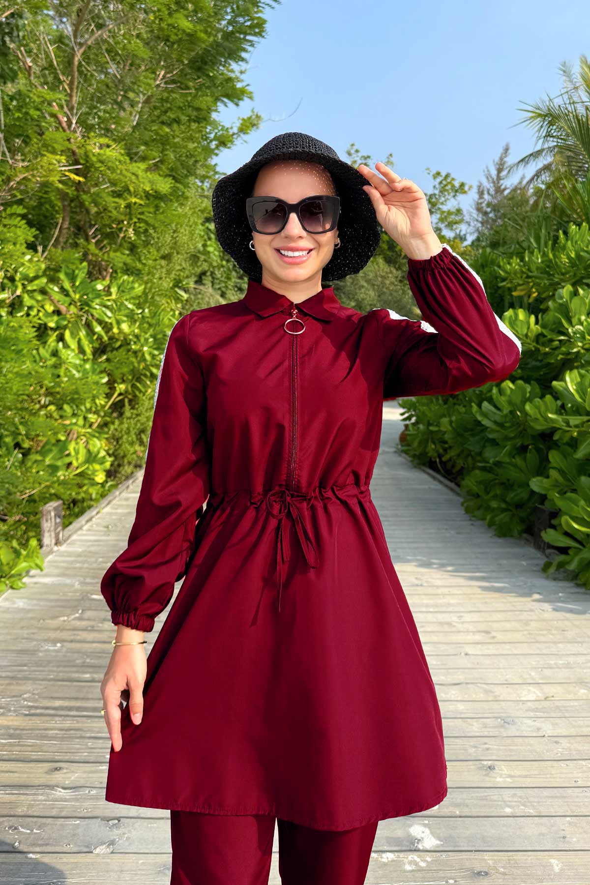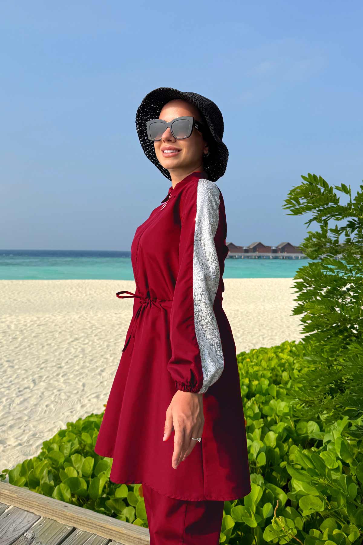 Sequin Detail Modest Swimsuit - Burgundy