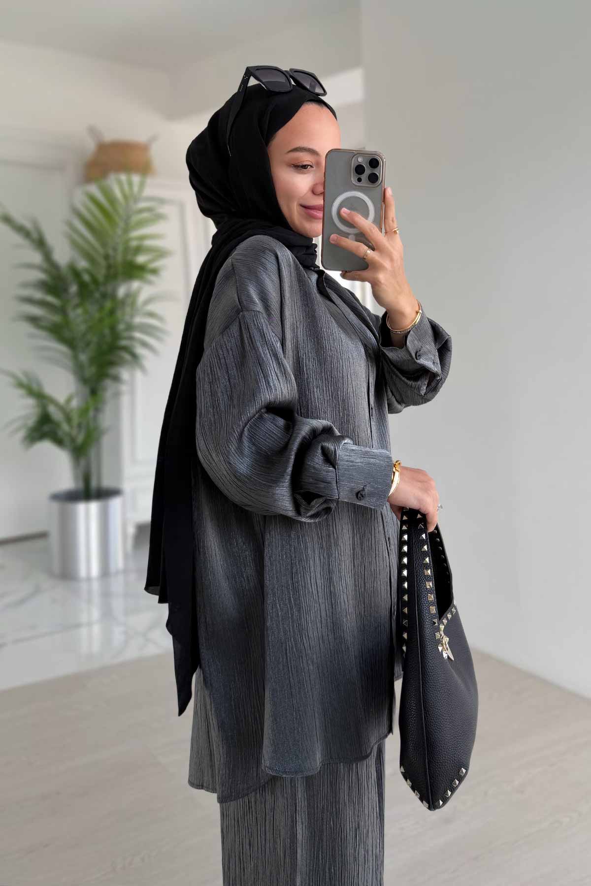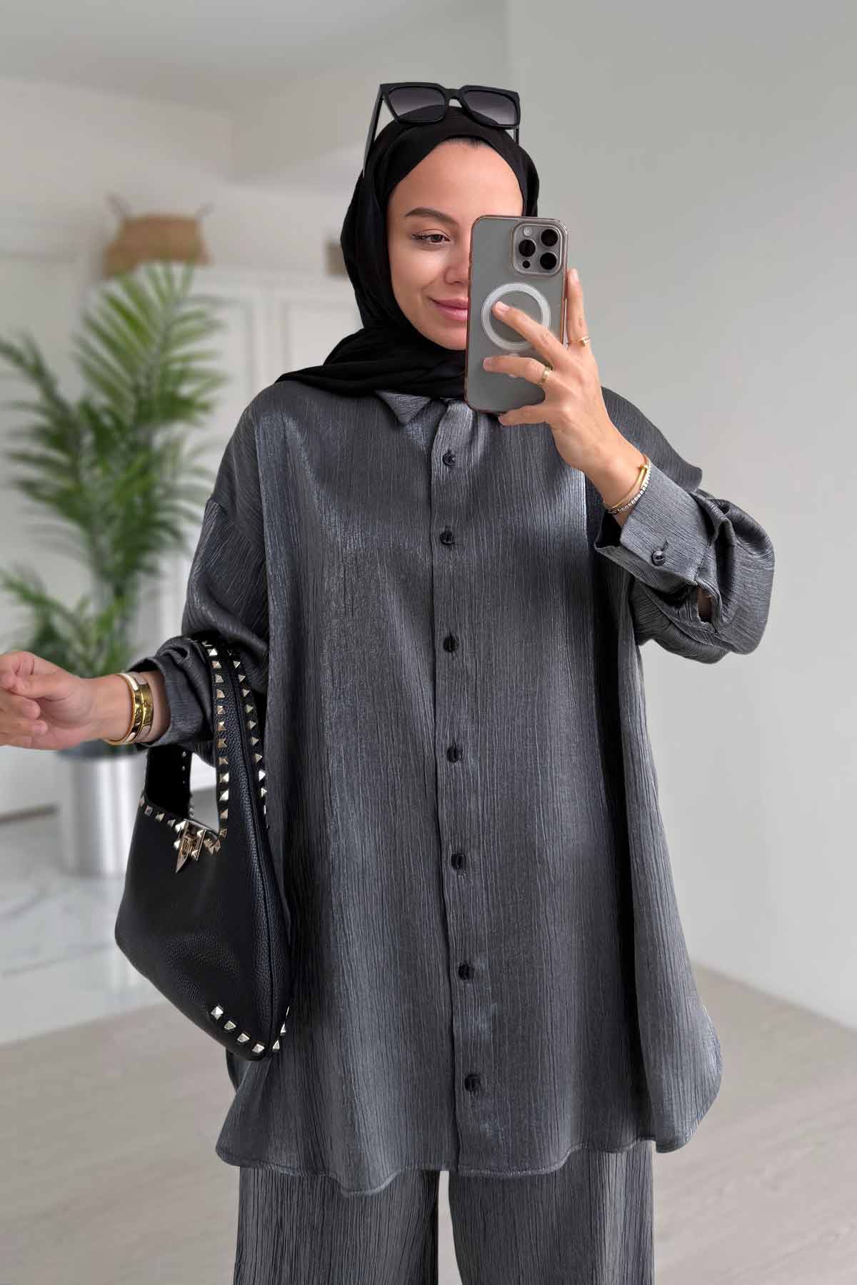 Shiny Textured Loose-Fit Two-Piece Suit - Anthracite